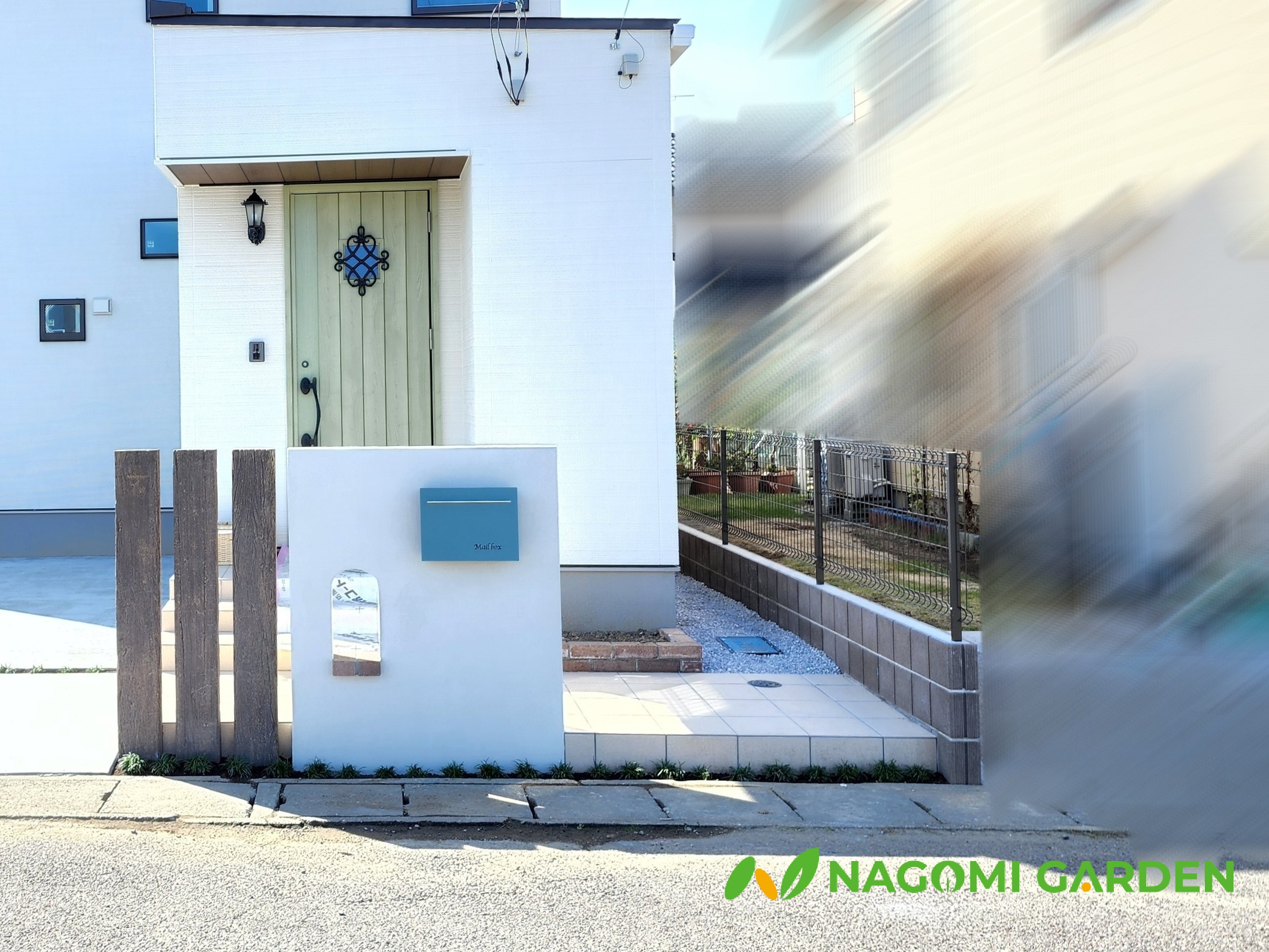 門柱は小窓が付いた可愛らしいデザインです。白い外壁にブルーのポストが映えます。